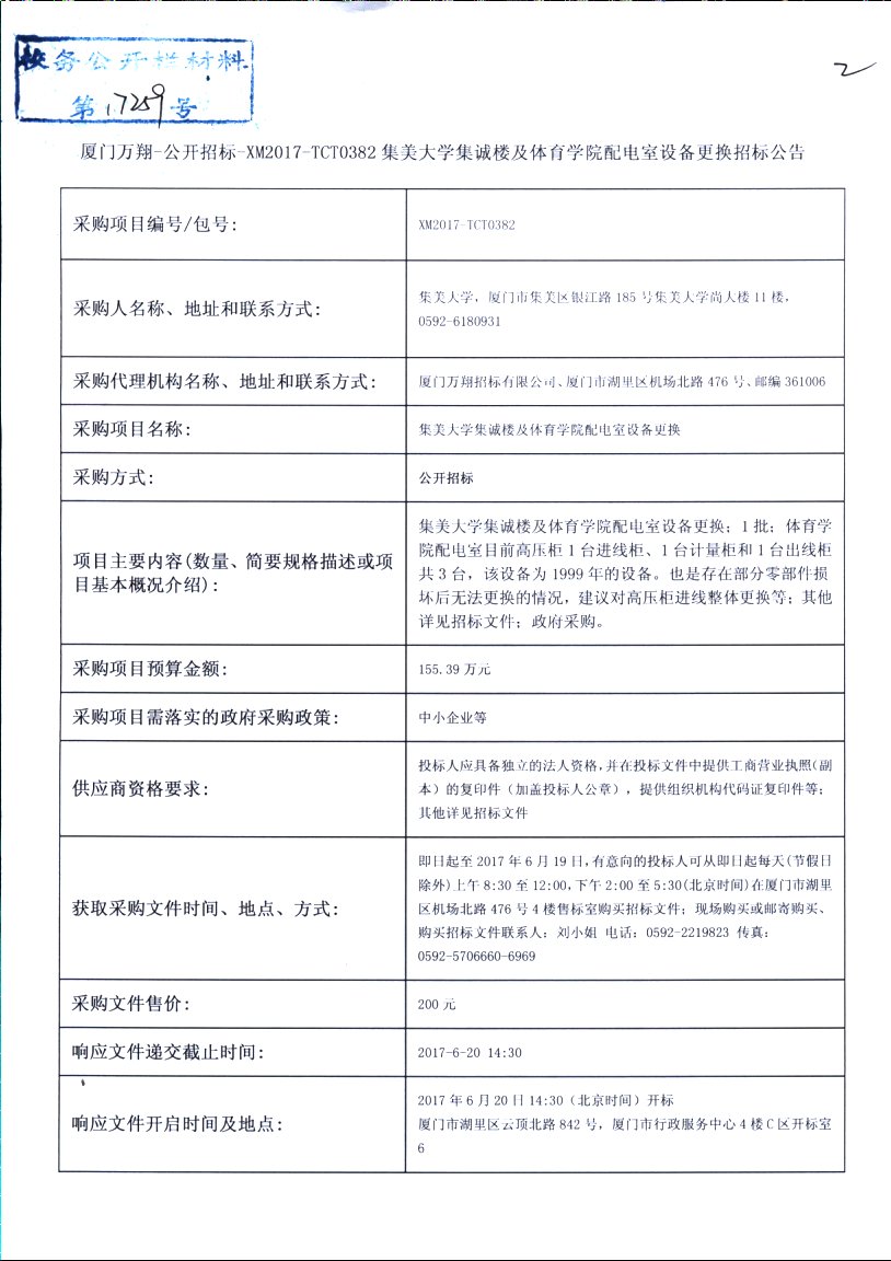 厦门万翔-公开招标-XM2017-TCT0382集美大学集诚楼及体育学院配电室设备更换招标公告