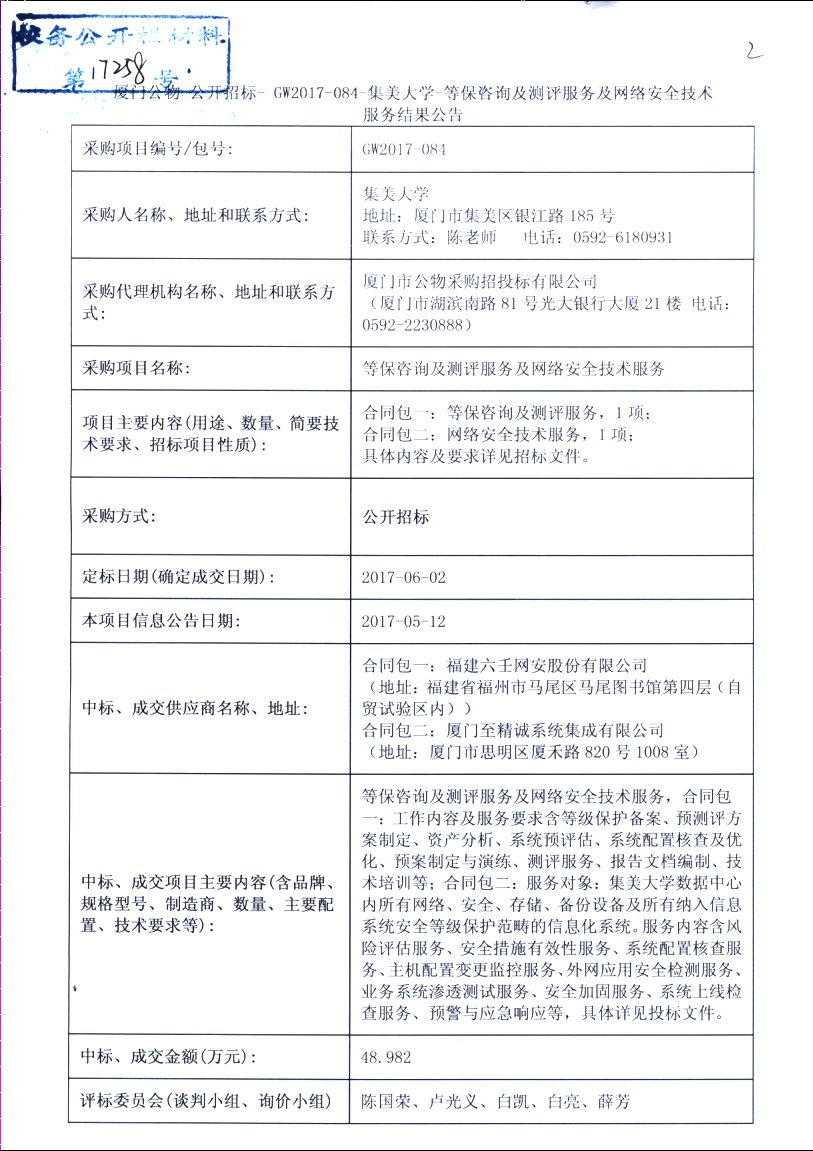 厦门公物-公开招标-GW2017-084-集美大学-等保咨询及测评服务及网络安全技术服务结果公告