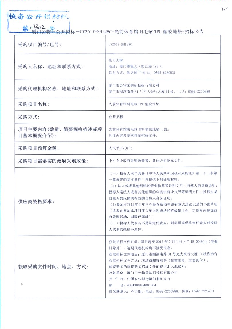 厦门公物-公开招标-GW2017-SH128C-光前体育馆羽毛球TPU塑胶地垫-招标公告