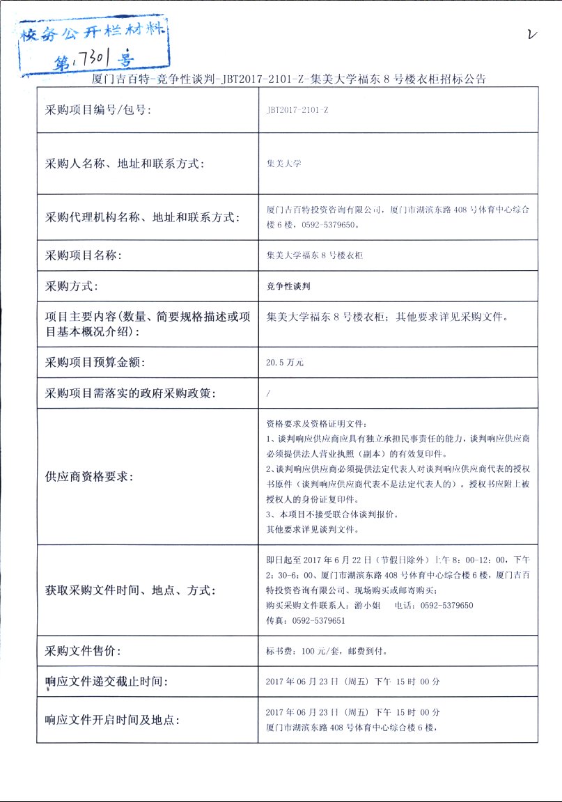 厦门吉百特-竞争性谈判-JBT2017-2101-Z-集美大学福东8号楼衣柜招标公告