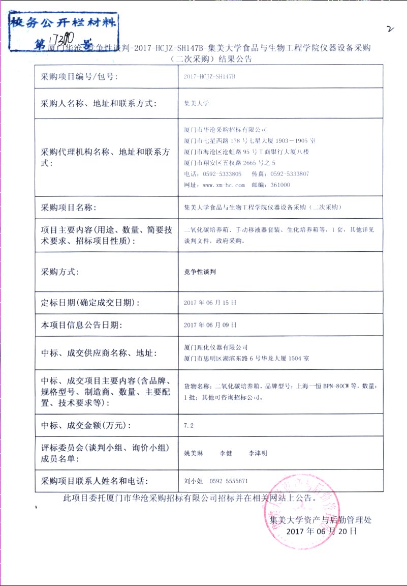 厦门华沧-竞争性谈判-2017-HCJZ-SH147B-集美大学食品与生物工程学院仪器设备采购(二次采购)结果公告