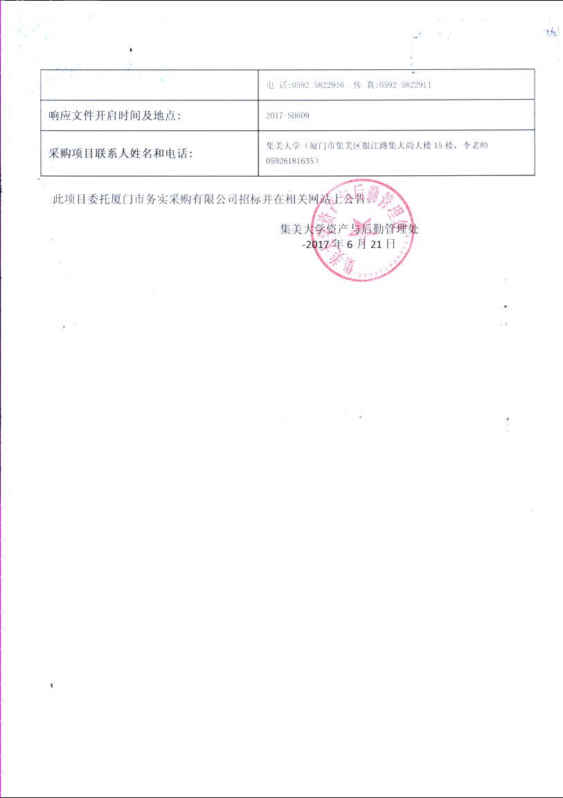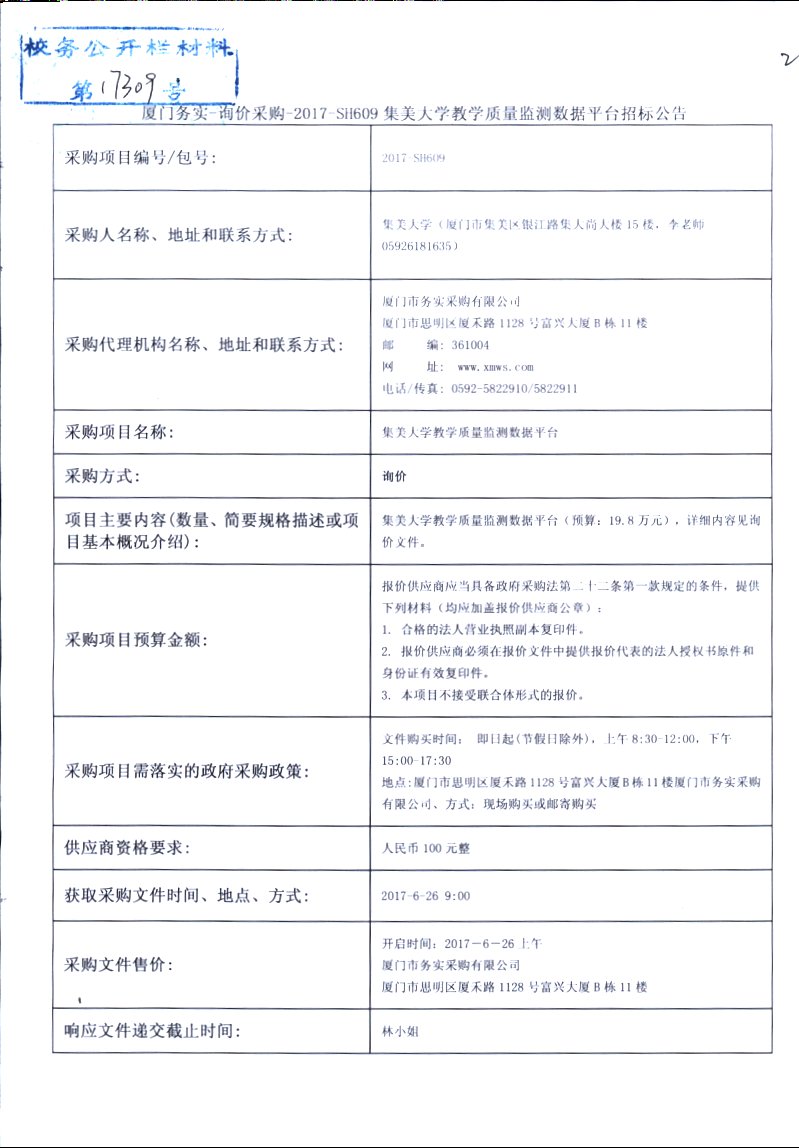 厦门务实-询价采购-2017-SH609集美大学教学质量监测数据平台招标公告