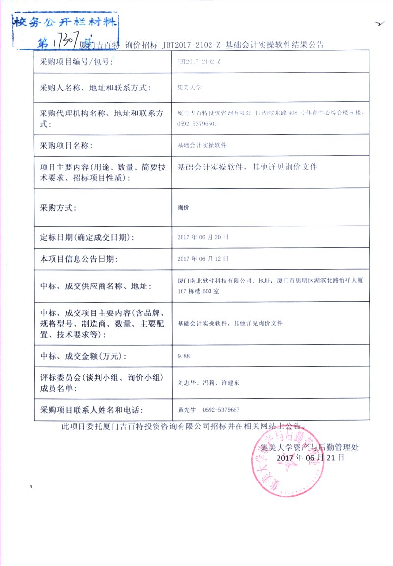 厦门吉百特-询价招标-JBT2017-2012-Z-基础会计实操软件结果公告
