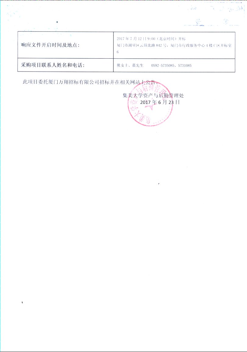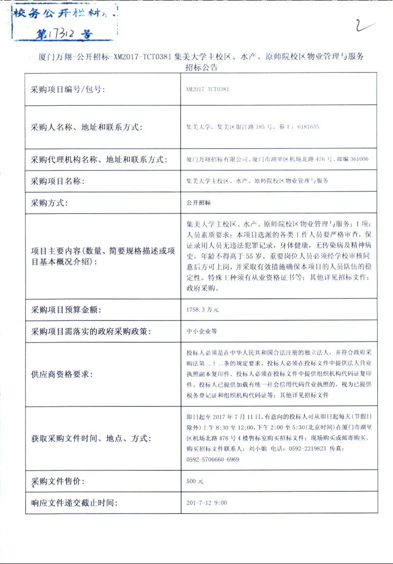 厦门万翔-公开招标-XM2017-TCT0381集美大学主校区、水产、原师院校区物业管理与服务招标公告