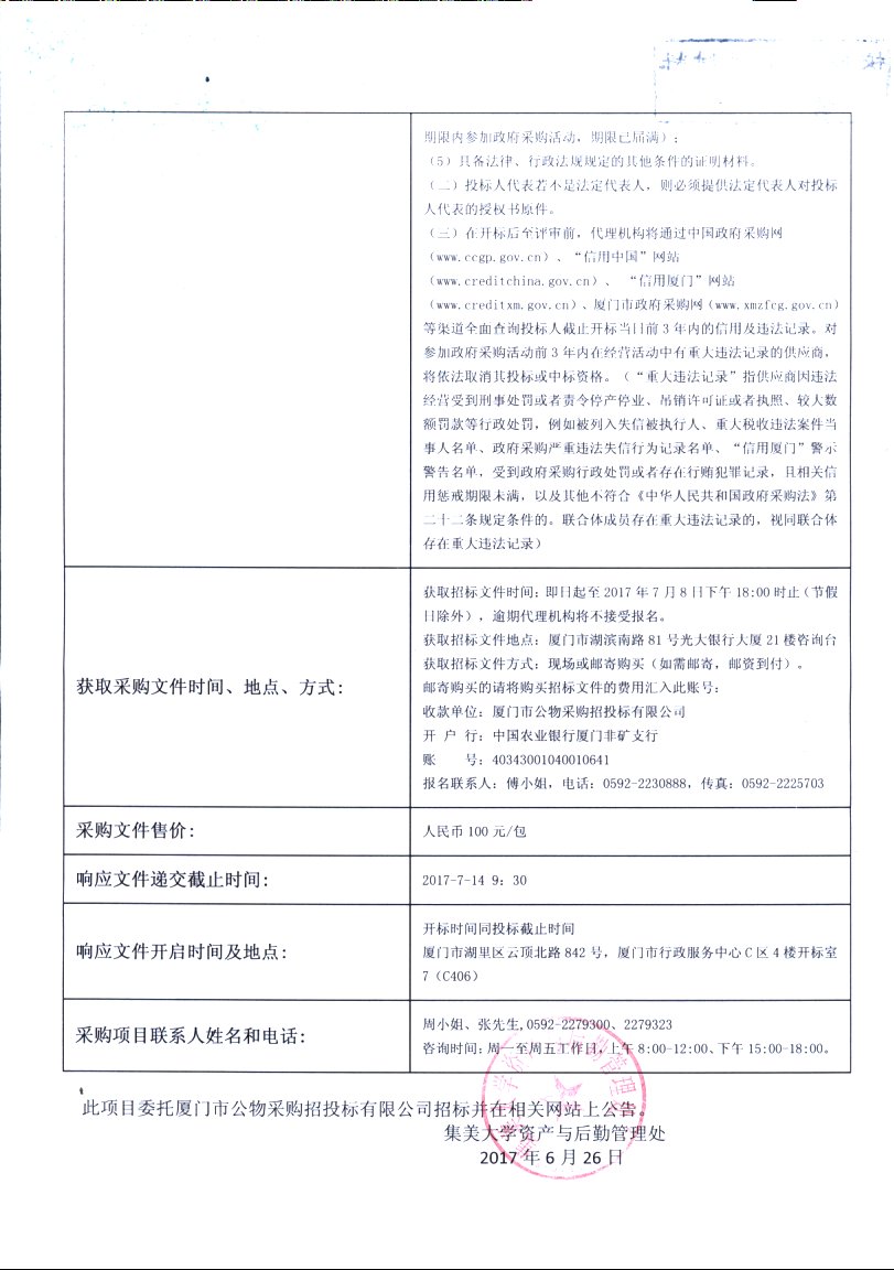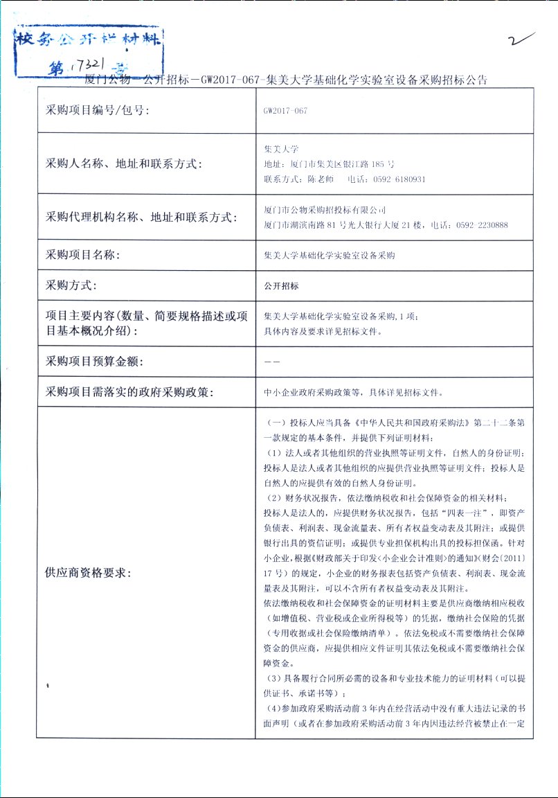 厦门公物-公开招标-GW2017-067-集美大学基础化学实验室设备采购招标公告