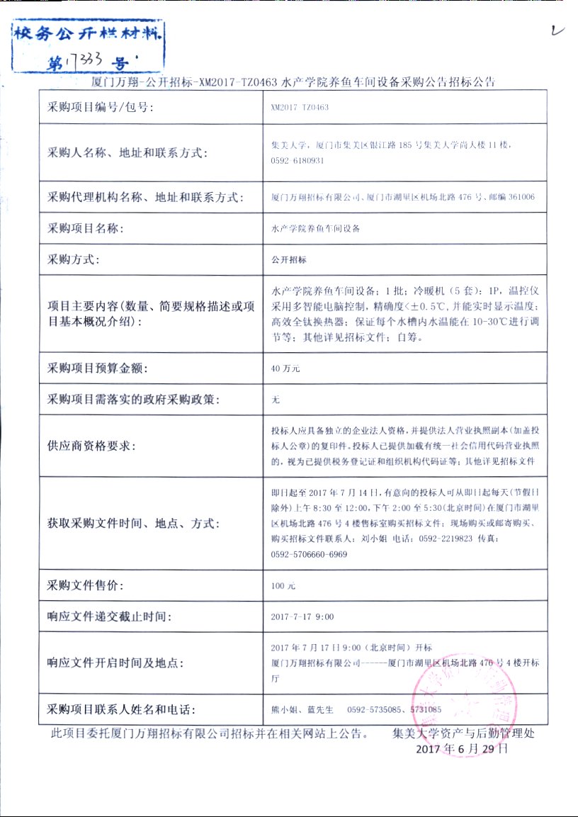 厦门万翔-公开招标-XM2017-TZ0463水产学院养鱼车间设备采购公告招标公告