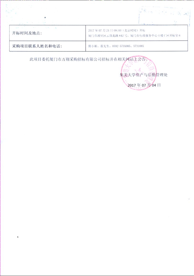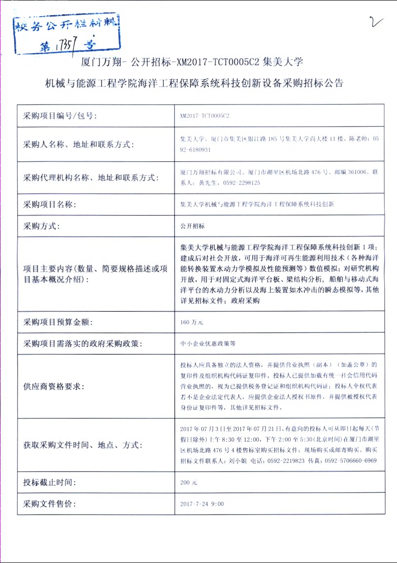 厦门万翔-公开招标-XM2017-TCT0005C2集美大学机械与能源工程学院海洋工程保障系统科技创新设备采购招标公告