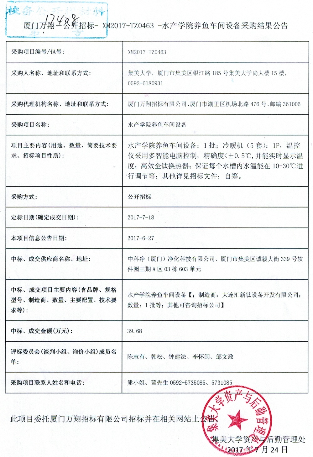 水产学院养鱼车间设备采购结果公告