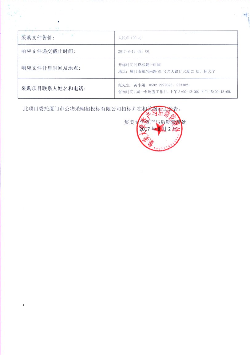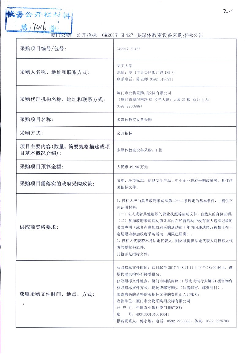 厦门公物-公开招标-GW2017-SH427-多媒体教室设备采购招标公告
