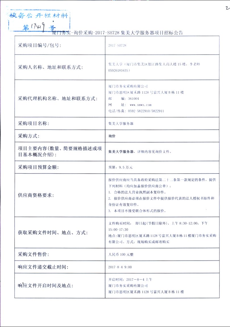 厦门务实-询价采购-2017-SH728集美大学服务器项目招标公告