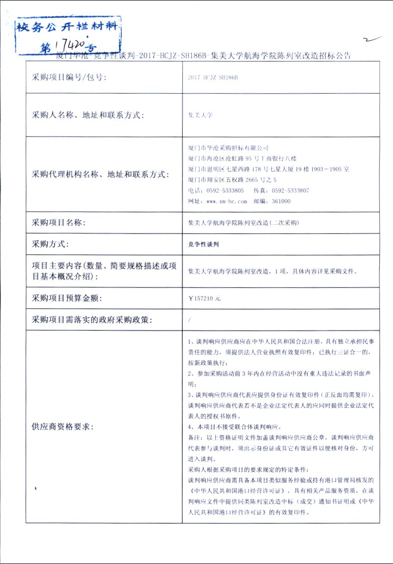 厦门华沧-竞争性谈判-2017-HCJZ-SH186B-集美大学航海学院陈列室改造招标公告