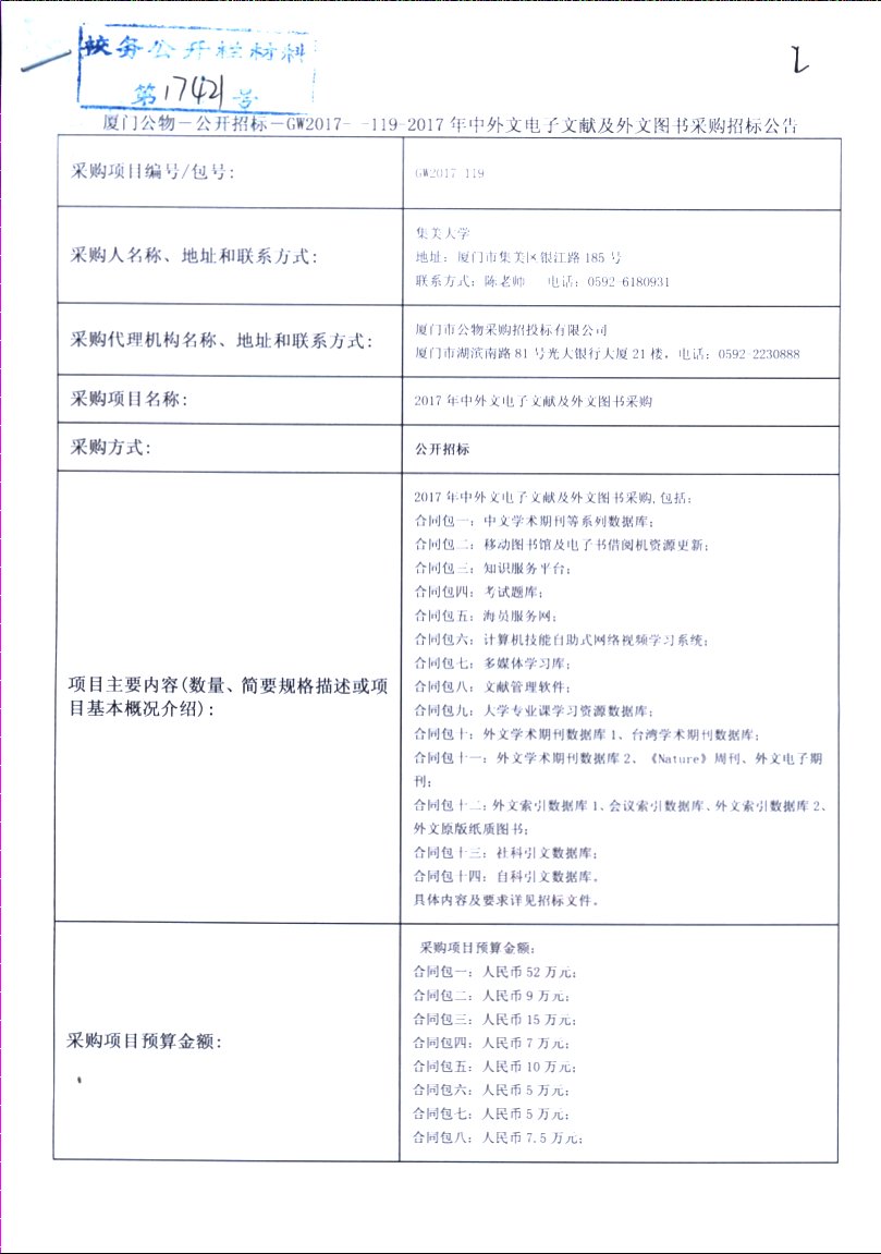 厦门公物-公开招标-GW2017-119-2017年中外文电子文献及外文图书采购招标公告
