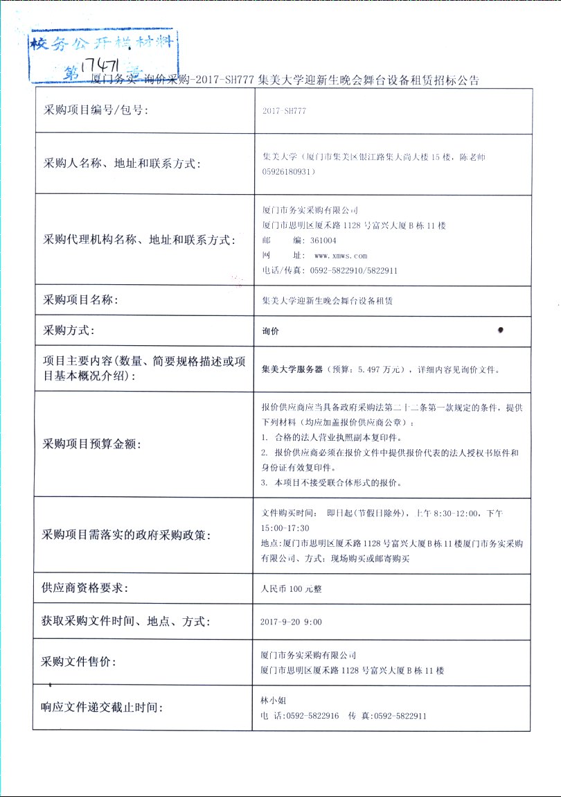 厦门务实-询价采购-2017-SH777集美大学迎新生晚会舞台设备租赁招标公告