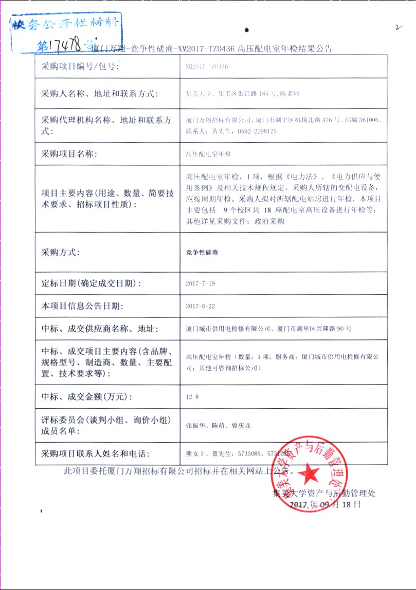 厦门万翔-竞争性磋商-XM2017-TZ0436高压配电室年检结果公告