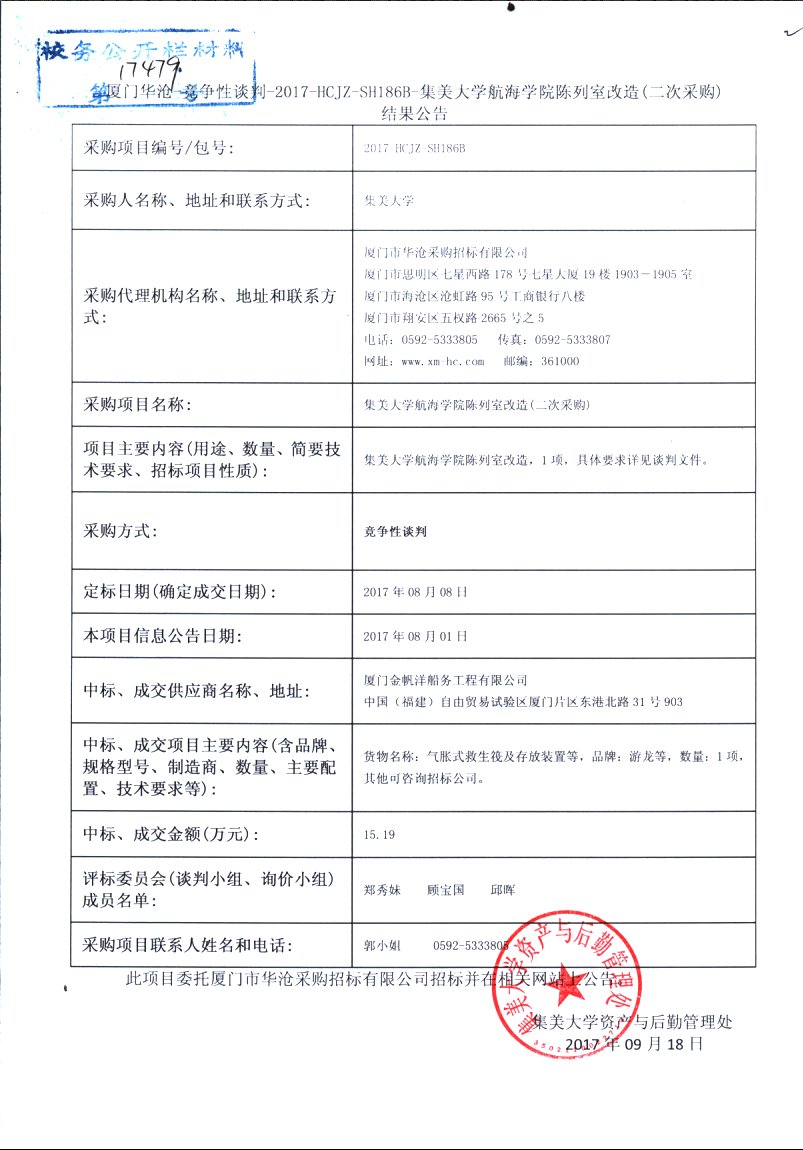 厦门华沧-竞争性谈判-2017-HCJZ-SH186B-集美大学航海学院陈列室改造(二次采购)结果公告
