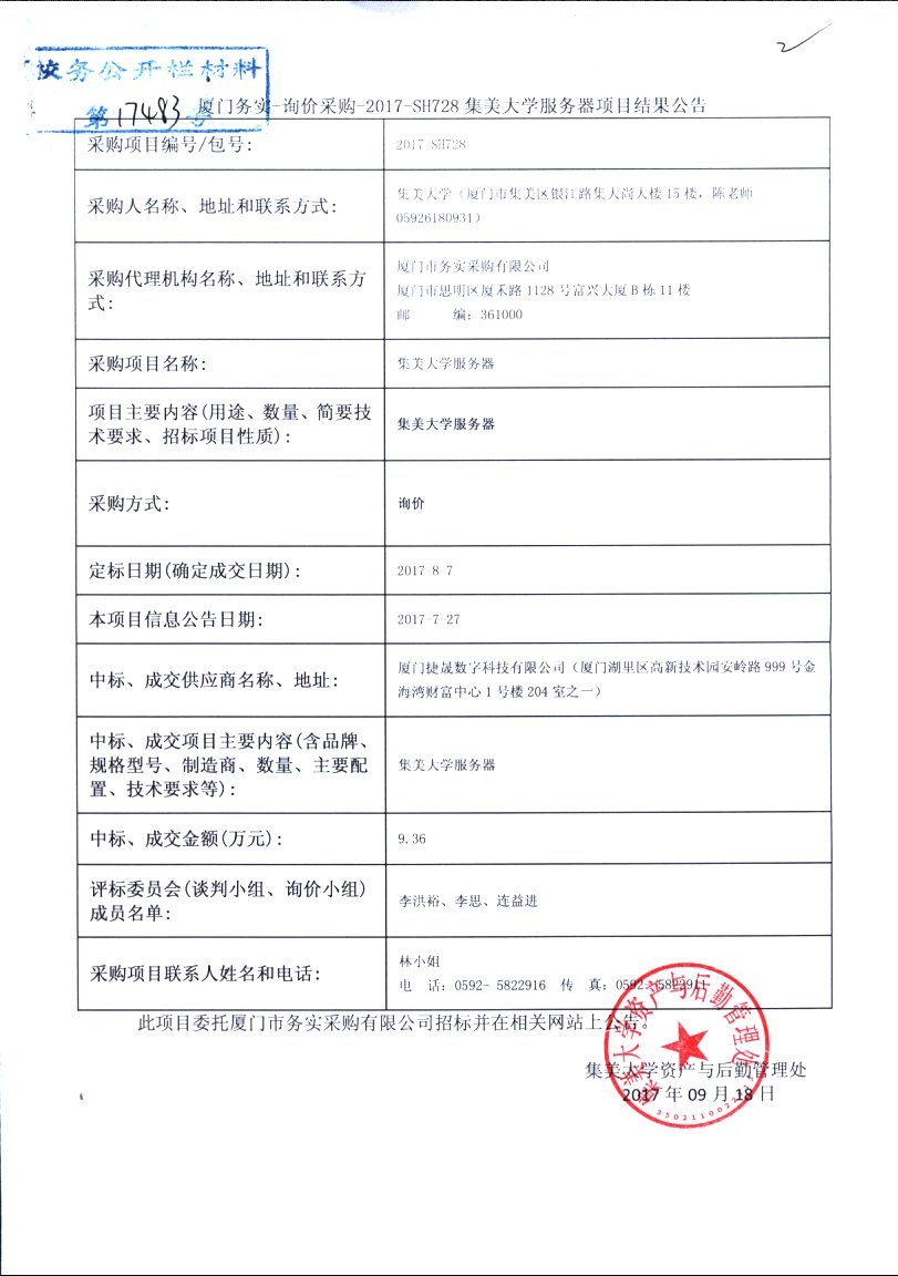 厦门务实-询价采购-2017-SH728集美大学服务器项目结果公告