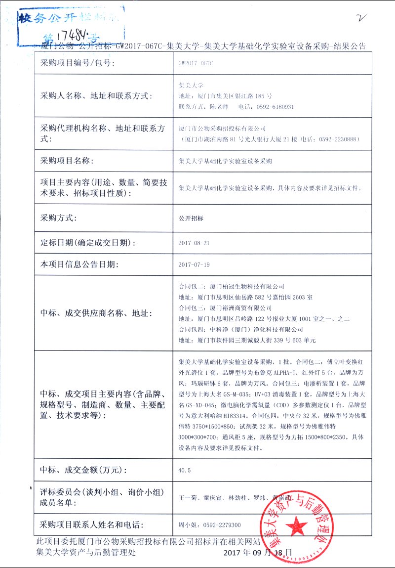 厦门公物-公开招标-GW2017-067C-集美大学-集美大学基础化学实验室设备采购-结果公告