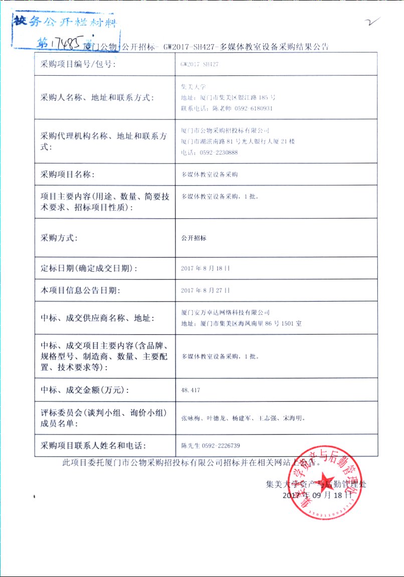 厦门公物-公开招标-GW2017-SH427-多媒体教室设备采购结果公告