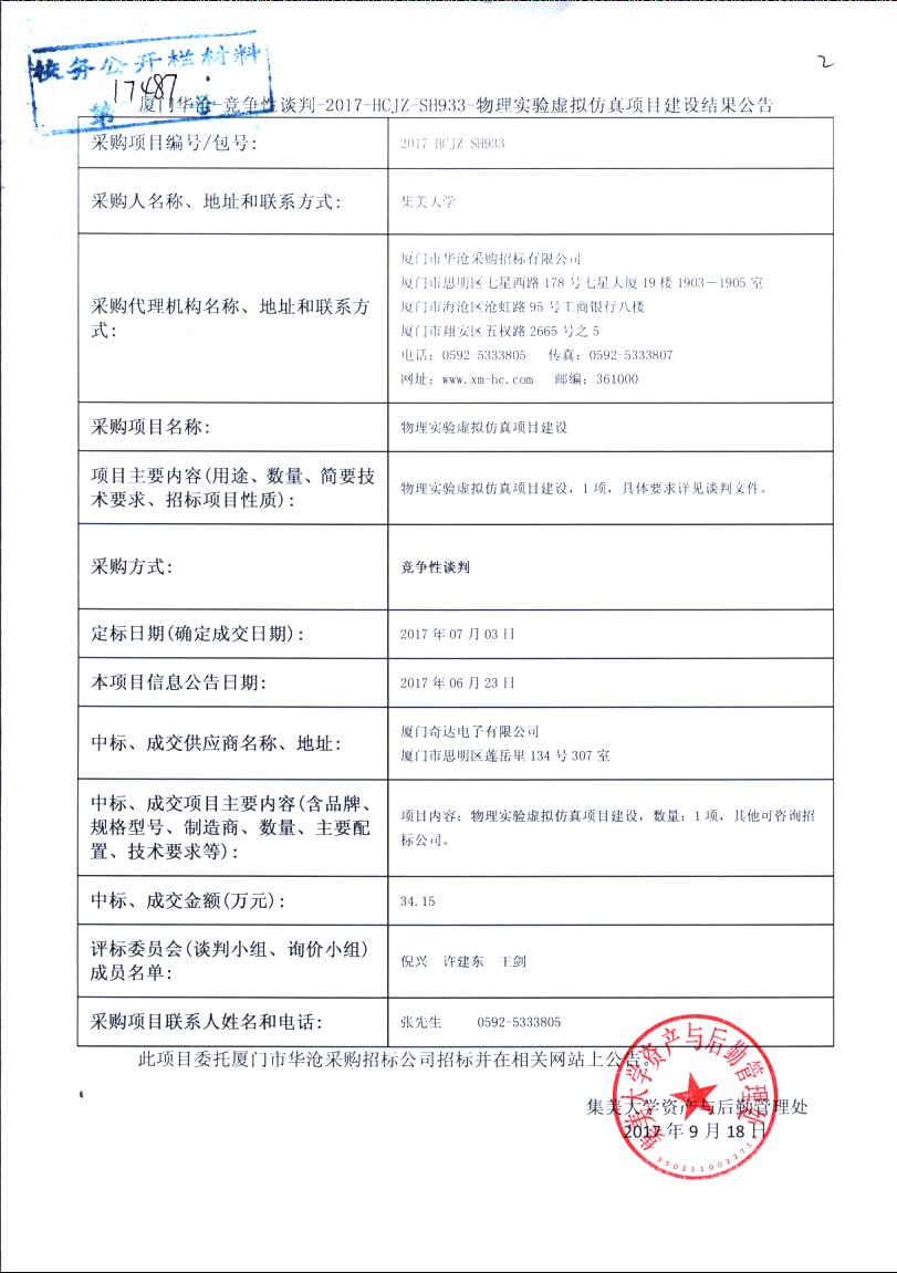 厦门华沧-竞争性谈判-2017-HCJZ-SH933-物理实验虚拟仿真项目建设结果公告