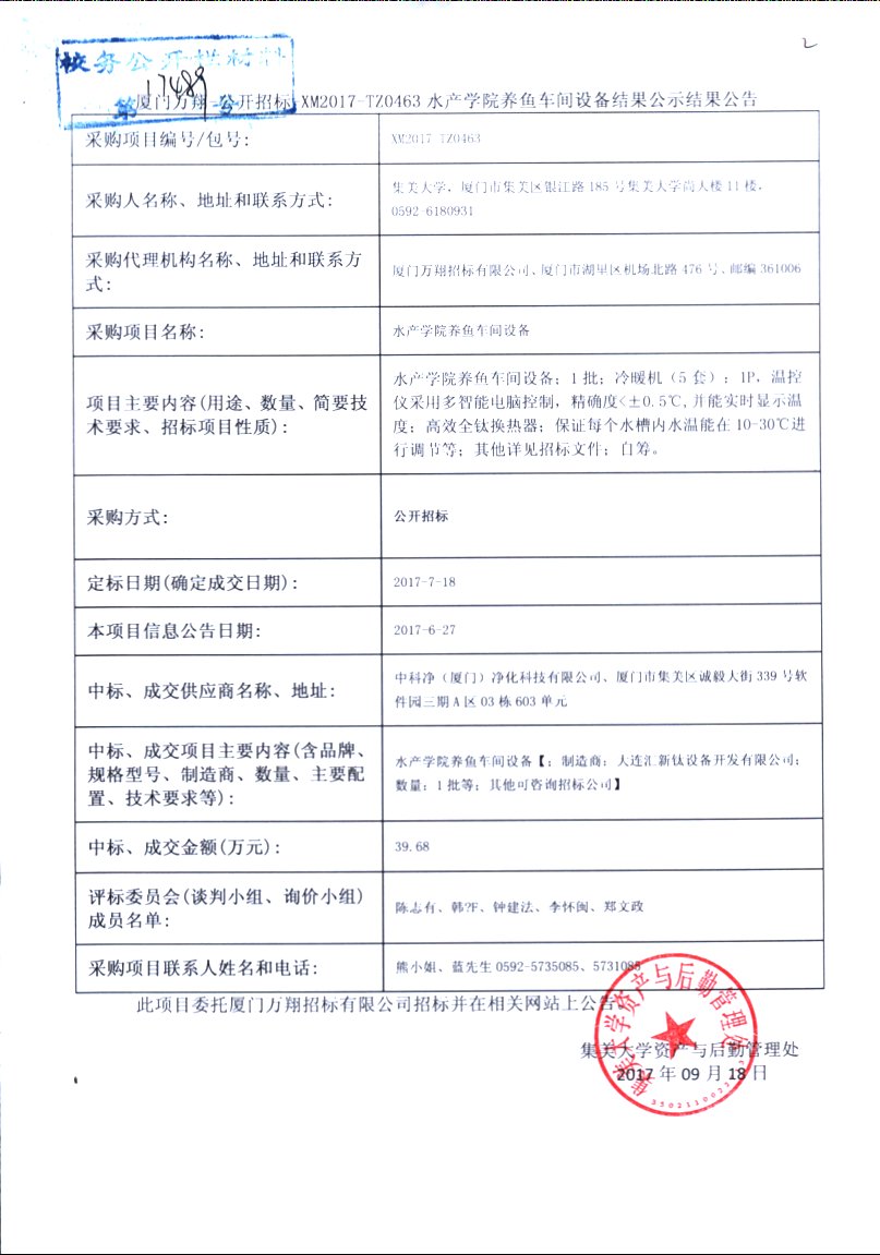 厦门万翔-公开招标-XM2017-TZ0463水产学院养鱼车间设备结果公示结果公告
