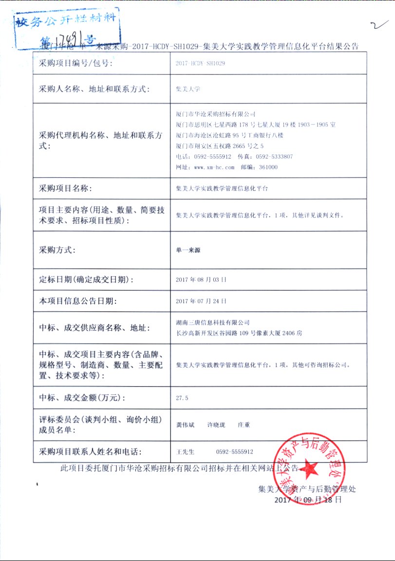 厦门华沧-来源采购-2017-HCDY-SH1029-集美大学实践教学管理信息化平台结果公告