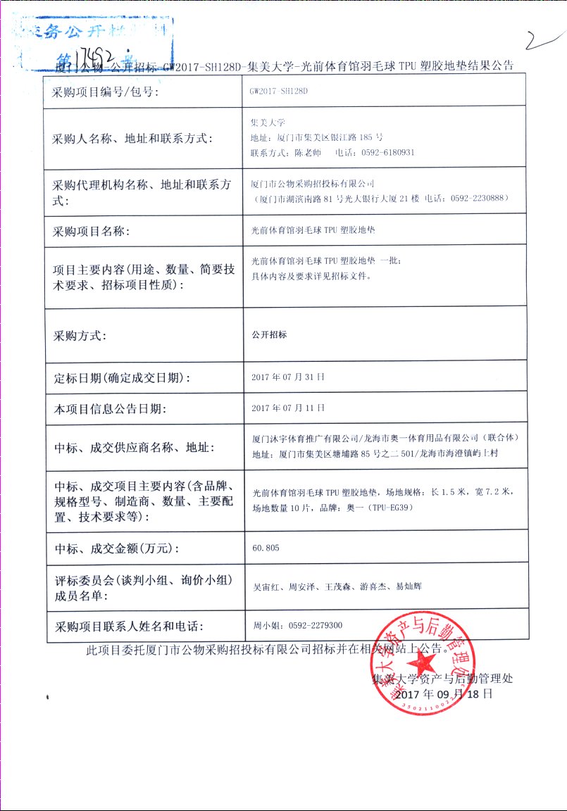 厦门公物-公开招标-GW2017-SH128D-集美大学-光前体育馆羽毛球TPU塑胶地垫结果公告