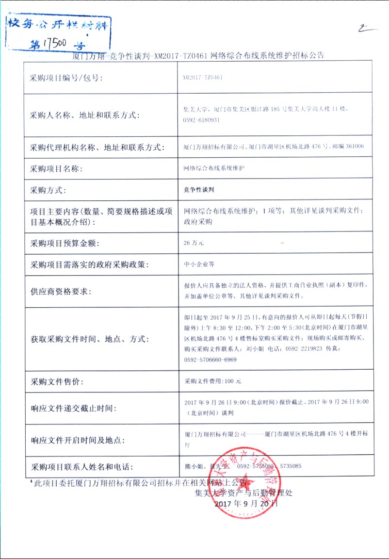 厦门万翔-竞争性谈判-XM2017-TZ0461网络综合布线系统维护招标公告