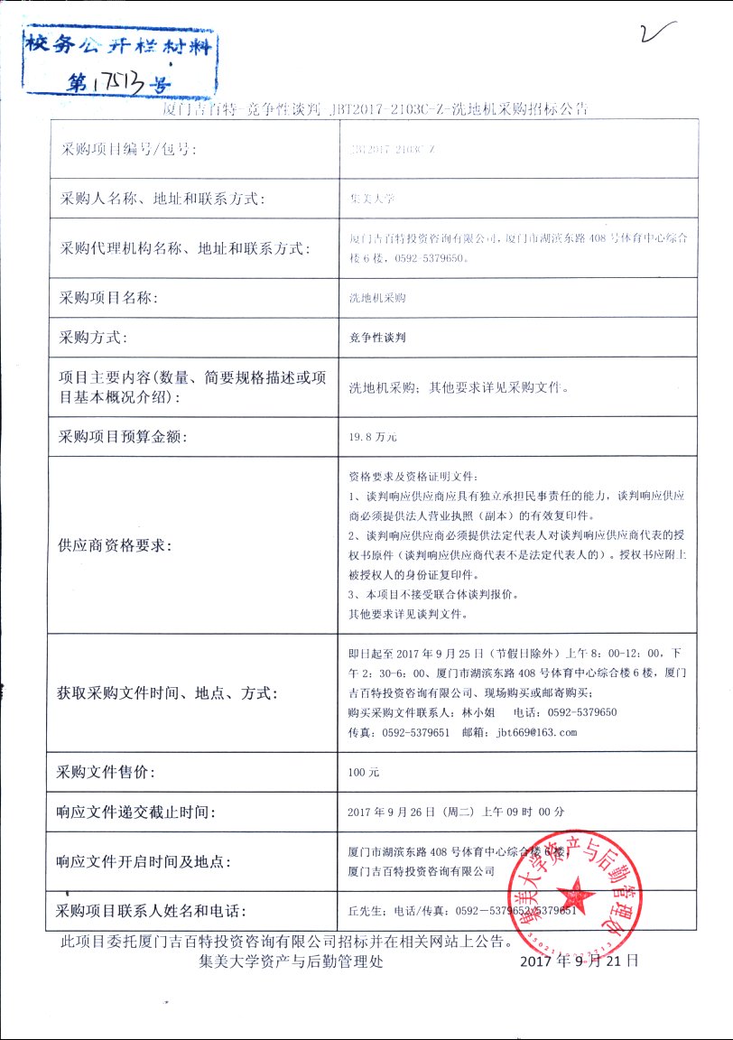 厦门吉百特-竞争性谈判-JBT2017-2103C-Z-洗地机采购招标公告