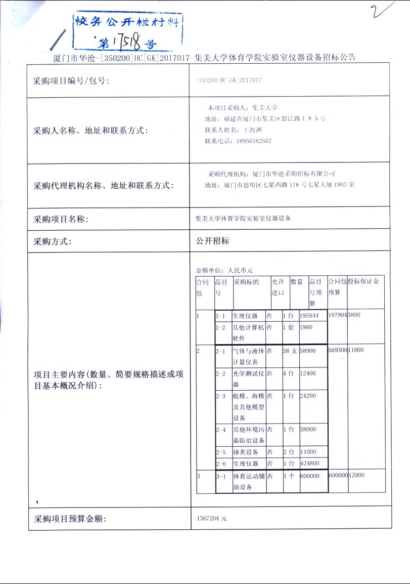厦门市华沧-[350200]HC[GK]2017017-集美大学体育学院实验室仪器设备招标公告