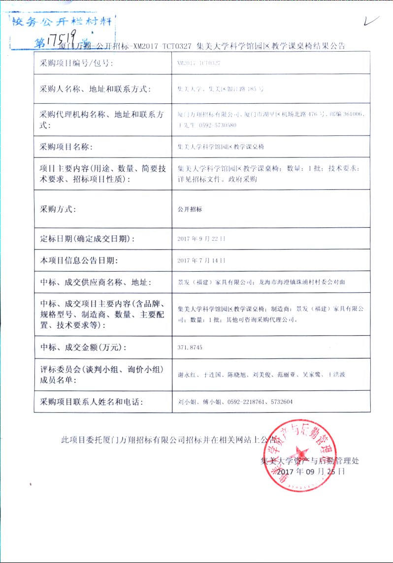 厦门市万翔-公开招标-XM2017-TCT0327集美大学科学馆园区教学课桌椅结果公告
