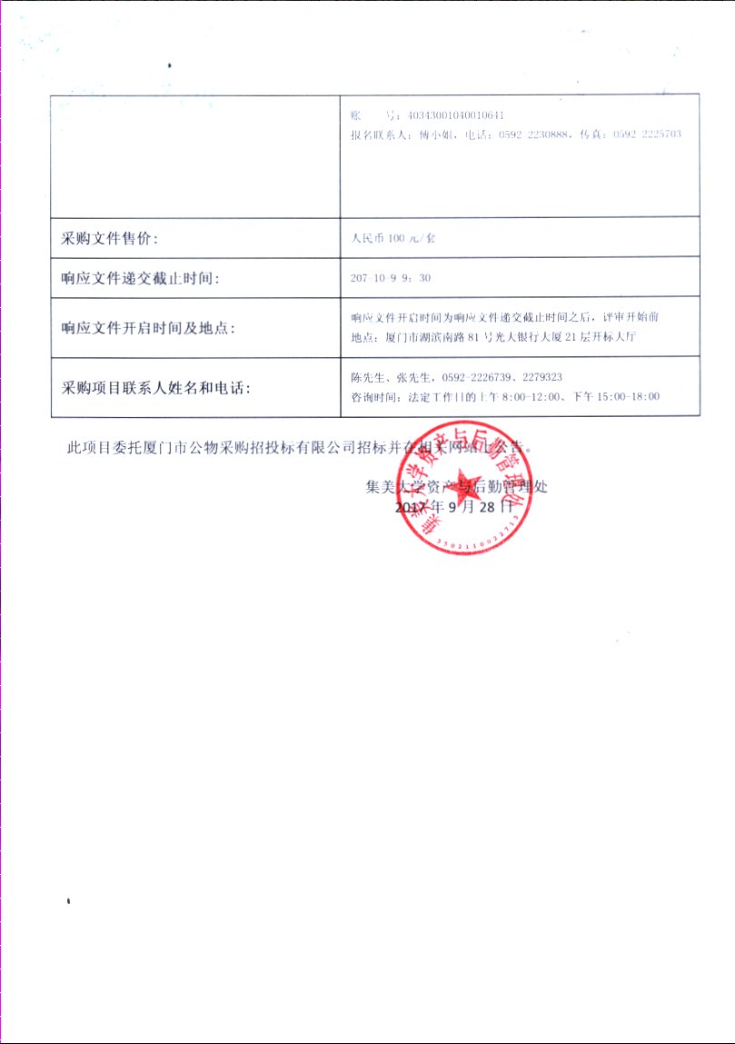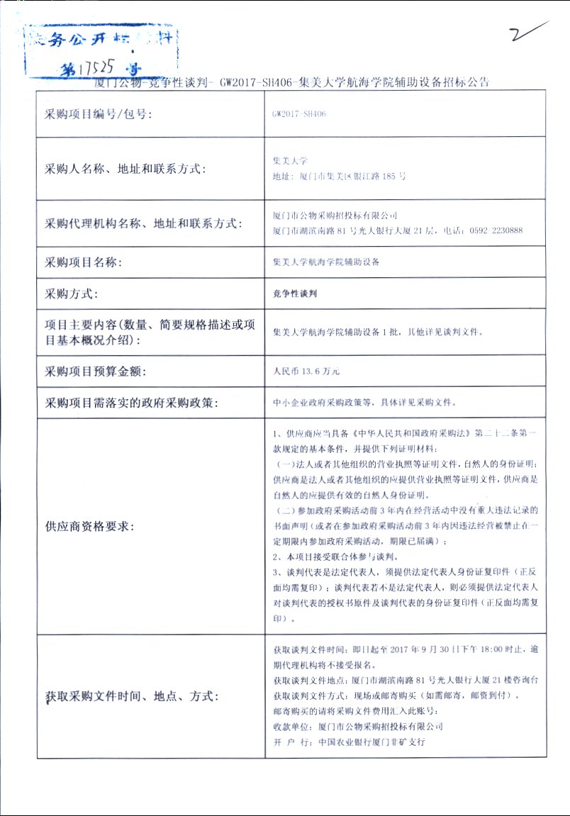 厦门公物-竞争性谈判-GW2017-SH406-集美大学航海学院辅助设备招标公告