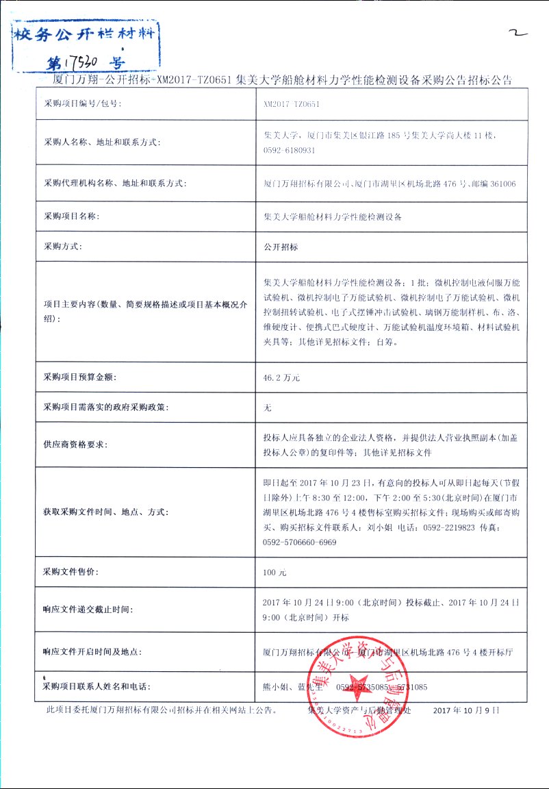 厦门万翔-公开招标-XM2017-TZ0651集美大学船舱材料力学性能检测设备采购公告招标公告