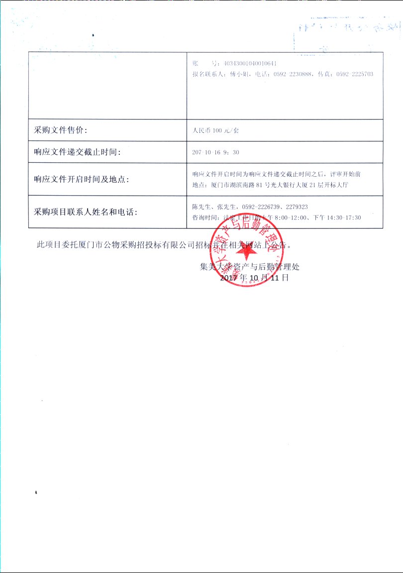 厦门公物-竞争性谈判-GW2017-SH406C-集美大学航海学院辅助设备招标公告