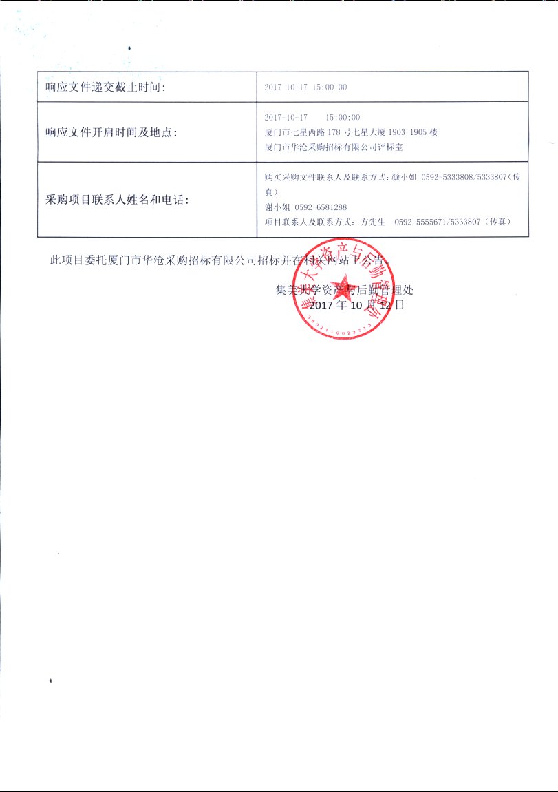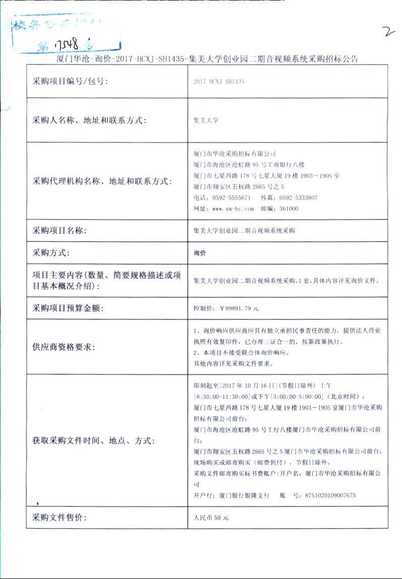 厦门华沧-询价-2017-HCXJ-SH1435-集美大学创业园二期音视频系统采购招标公告