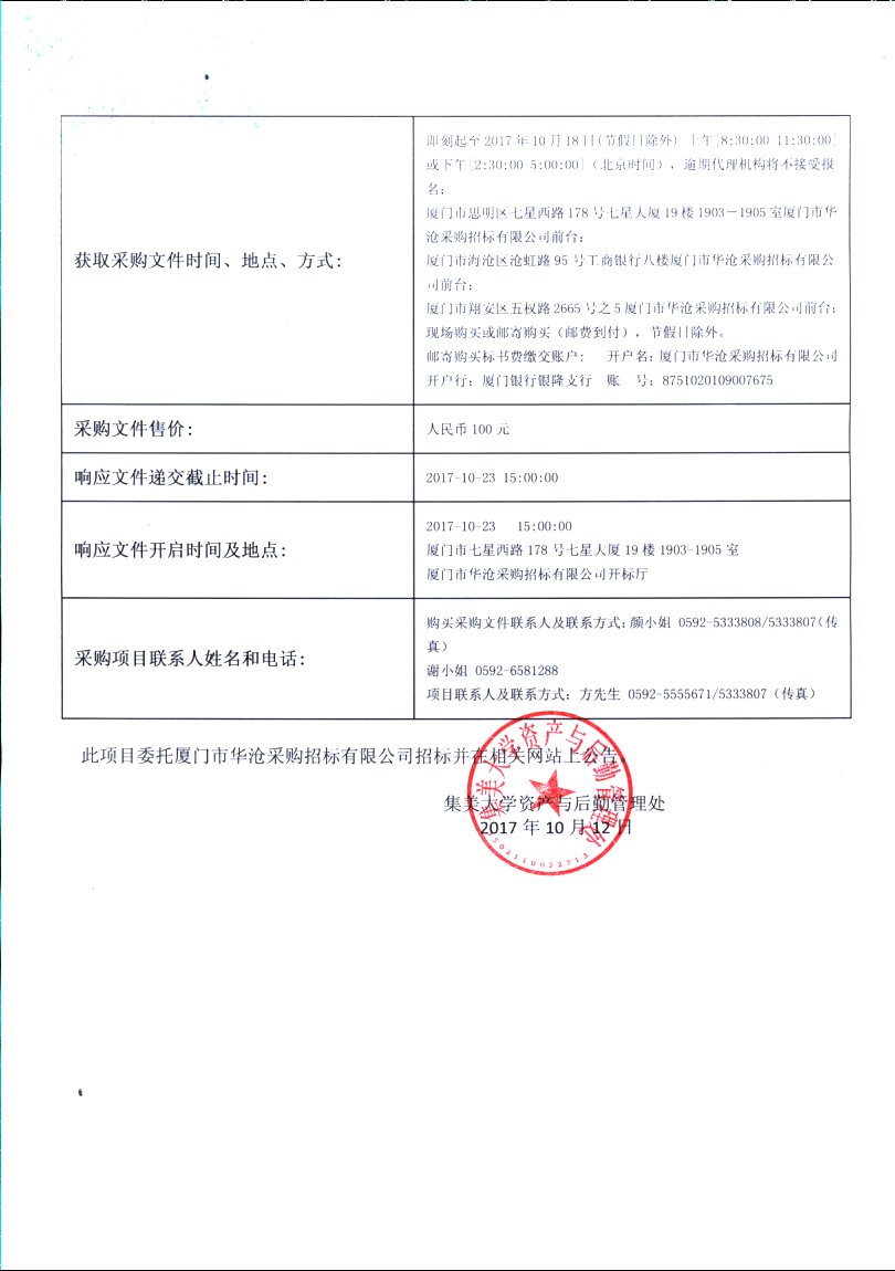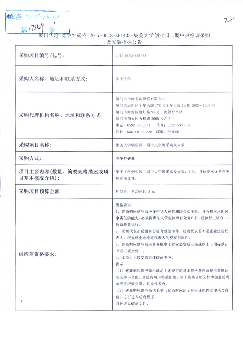 厦门华沧-竞争性谈判-2017-HCCS-SH1433-集美大学创业园二期中央空调采购及安装招标公告