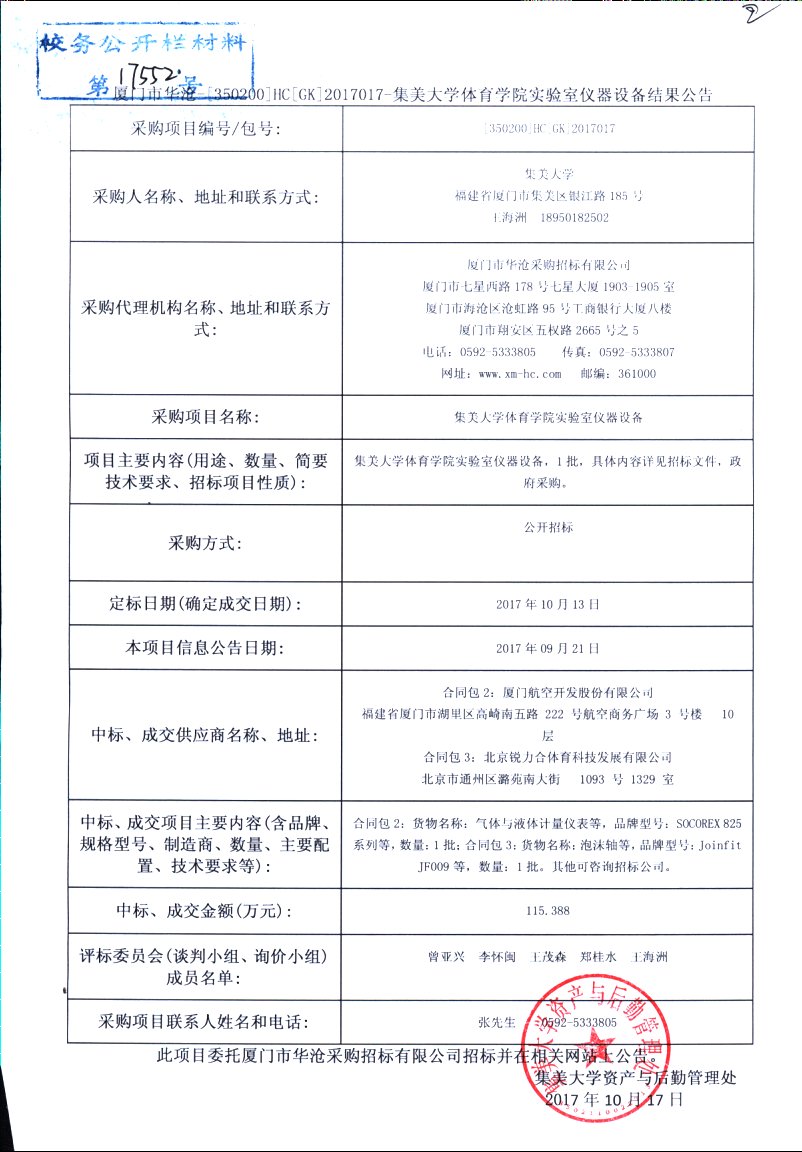 厦门市华沧-[350200]HC[GK]2017017-集美大学体育学院实验室仪器设备结果公告