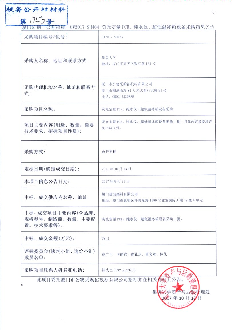 厦门公物-公开招标-GW2017-SH464-荧光定量PCR、纯水仪、超低温冰箱设备采购结果公告