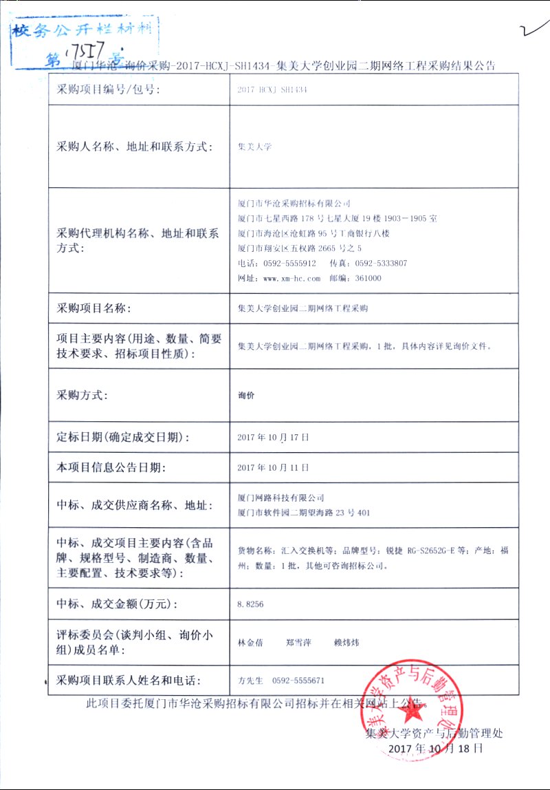 厦门华沧-询价采购-2017-HCXJ-SH1434-集美大学创业园二期网络工程采购结果公告