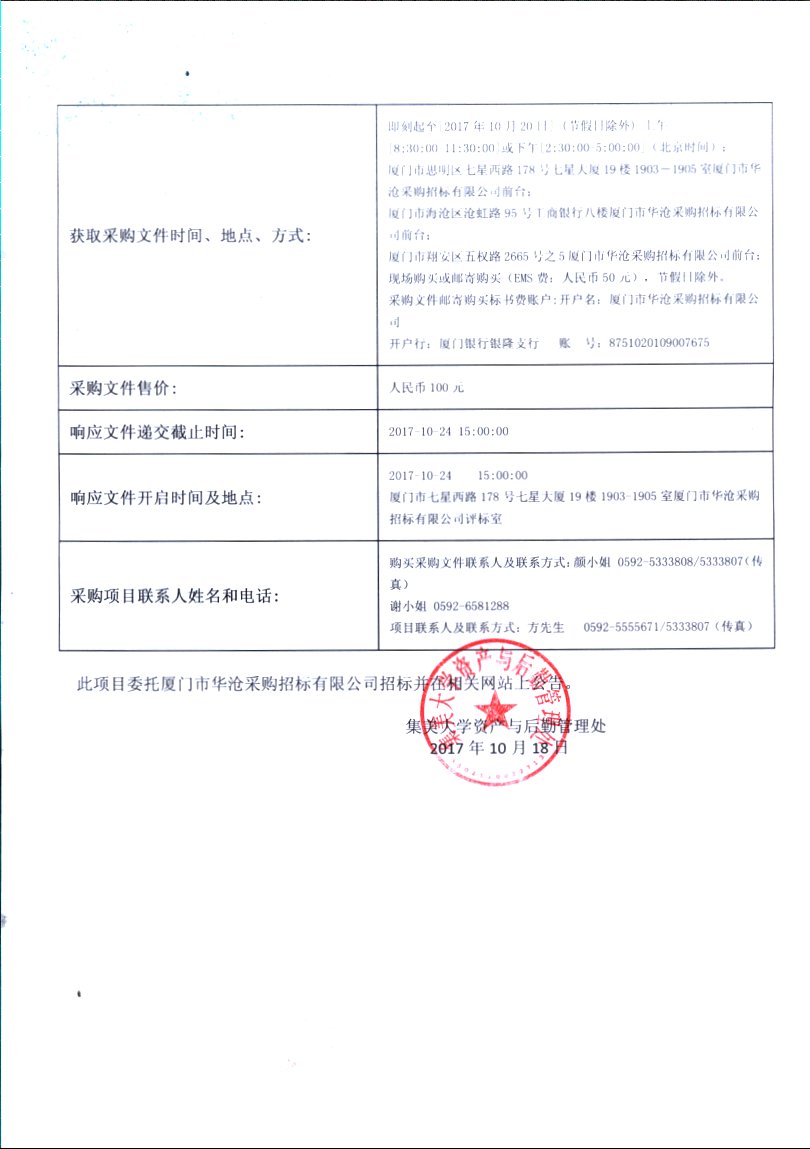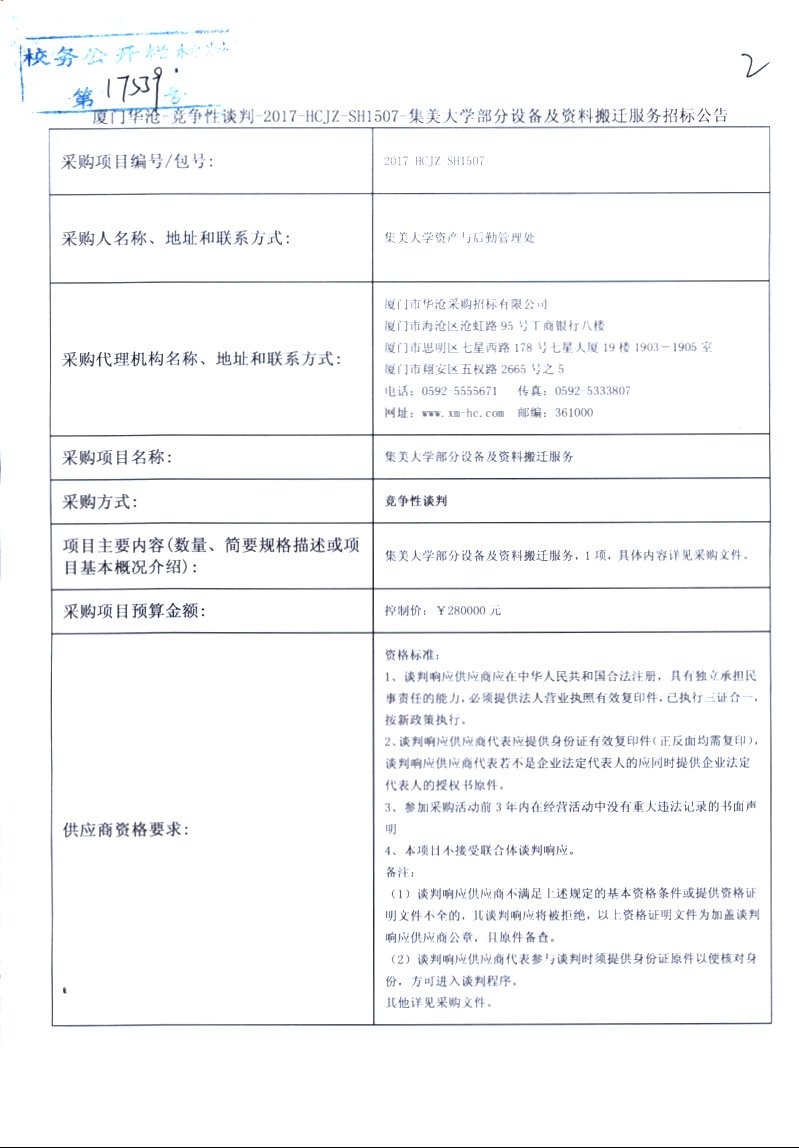 厦门华沧-竞争性谈判-2017-HCJZ-SH1507-集美大学部分设备及资料搬迁服务招标公告