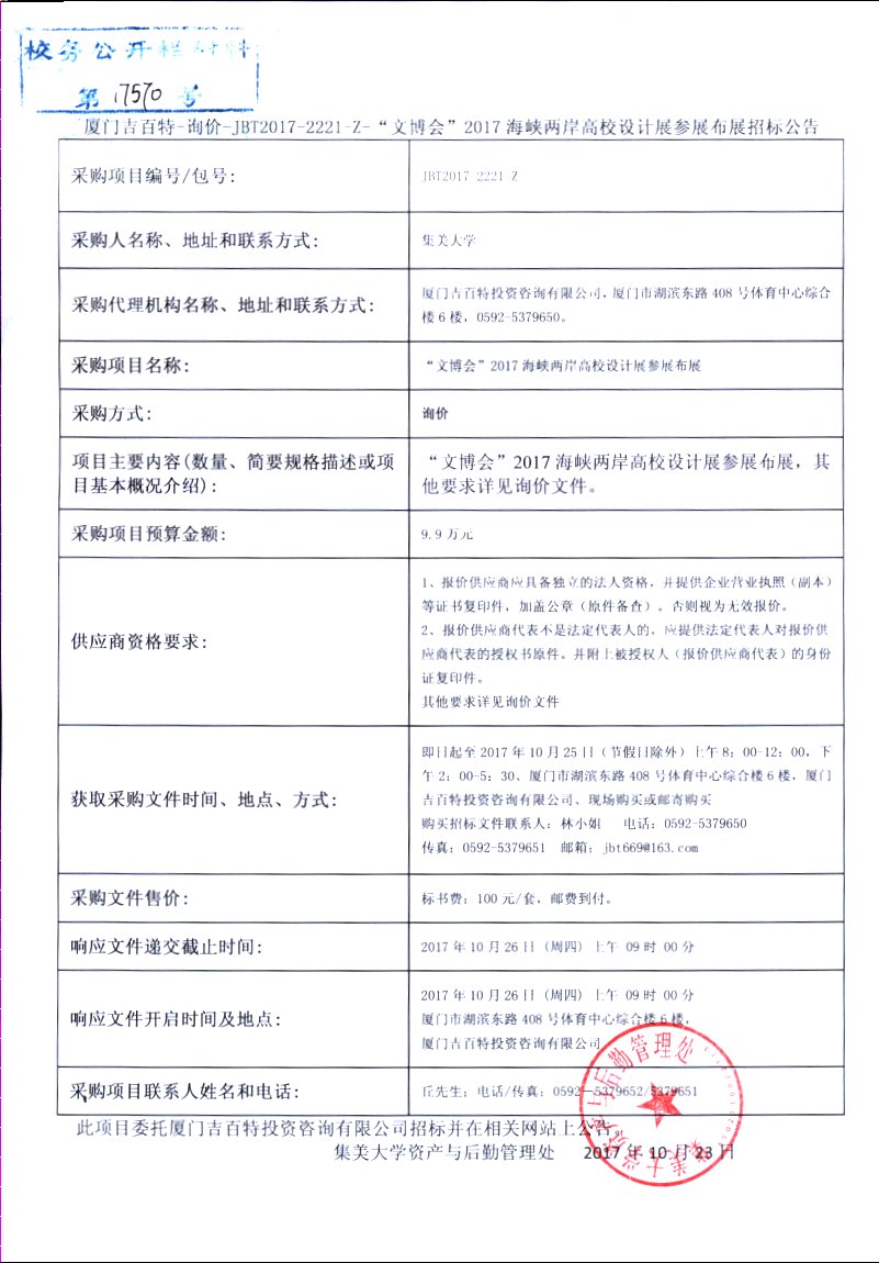 厦门吉百特-询价-JBT2017-2221-Z-“文博会”2017海峡两岸高校设计展参展布展招标公告
