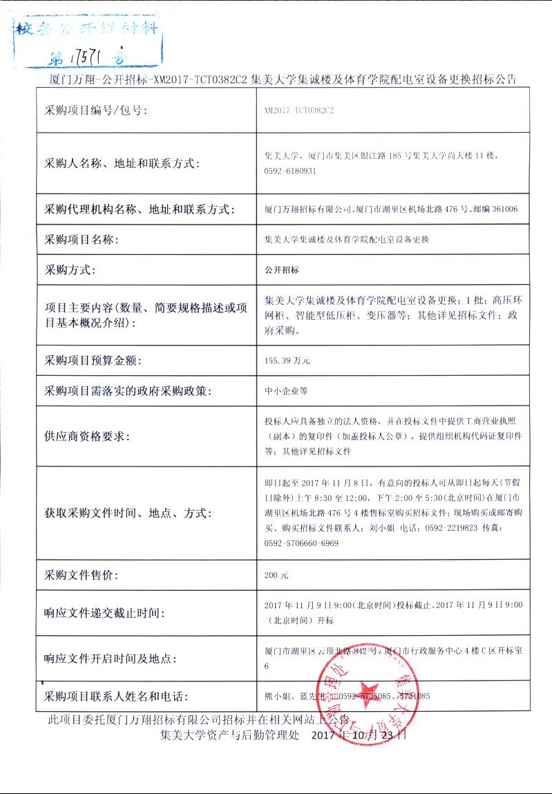 厦门万翔-公开招标-XM2017-TCT0382C2集美大学集诚楼及体育学院配电室设备更换招标公告