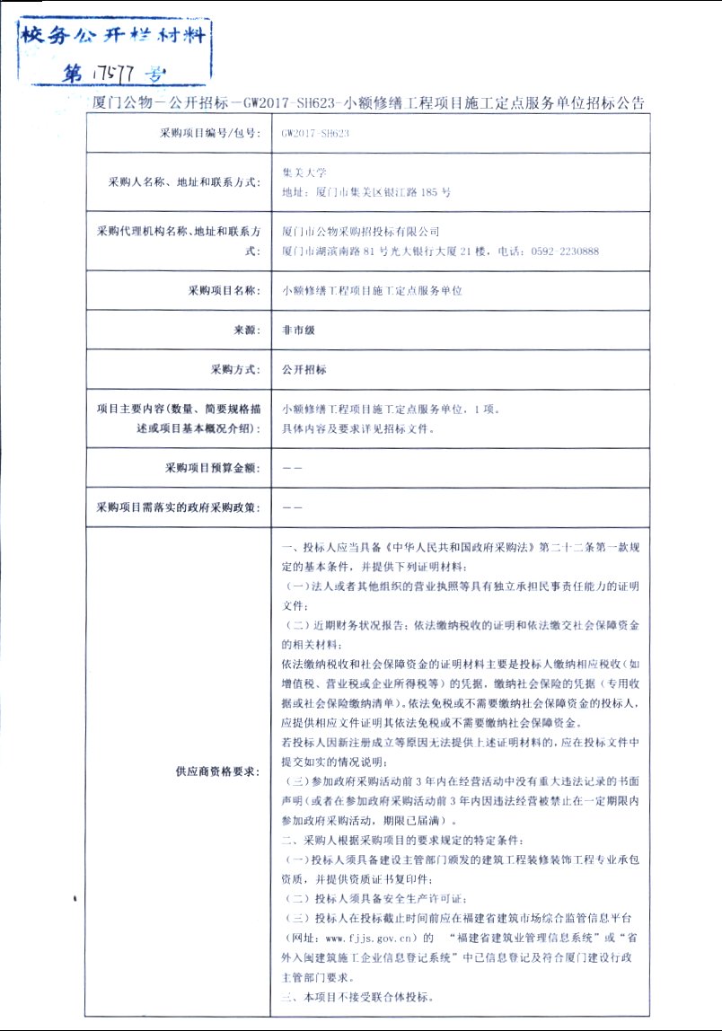 厦门公物-公开招标-GW2017-SH623-小额修缮工程项目施工定点服务单位招标公告