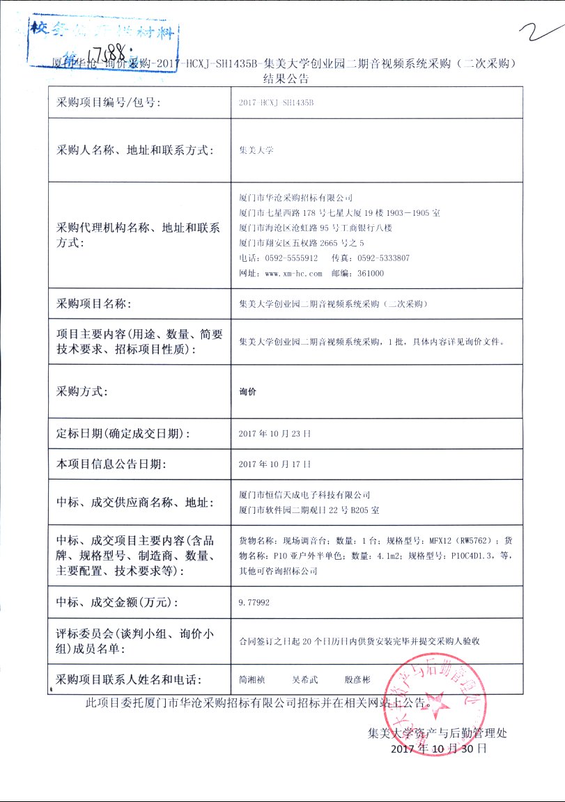 厦门华沧-询价采购-2017-HCXJ-SH1435B-集美大学创业园二期音视频系统采购(二次采购)结果公告