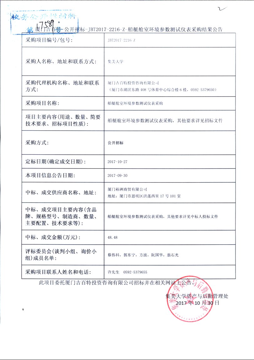 厦门吉百特-公开招标-JBT2017-2216-Z-船艇舱室环境参数测试仪表采购结果公告