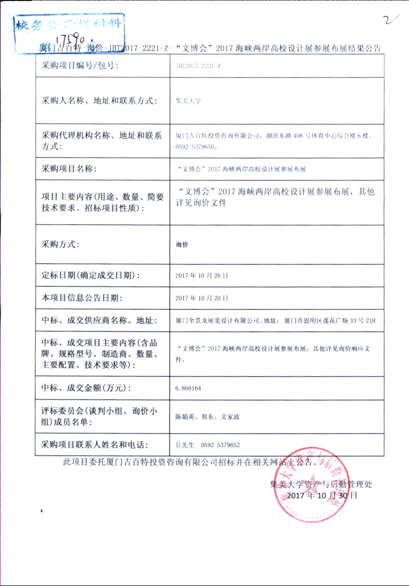 厦门吉百特-询价-JBT2017-2221-Z-“文博会”2017海峡两岸高校设计展参展布展结果公告
