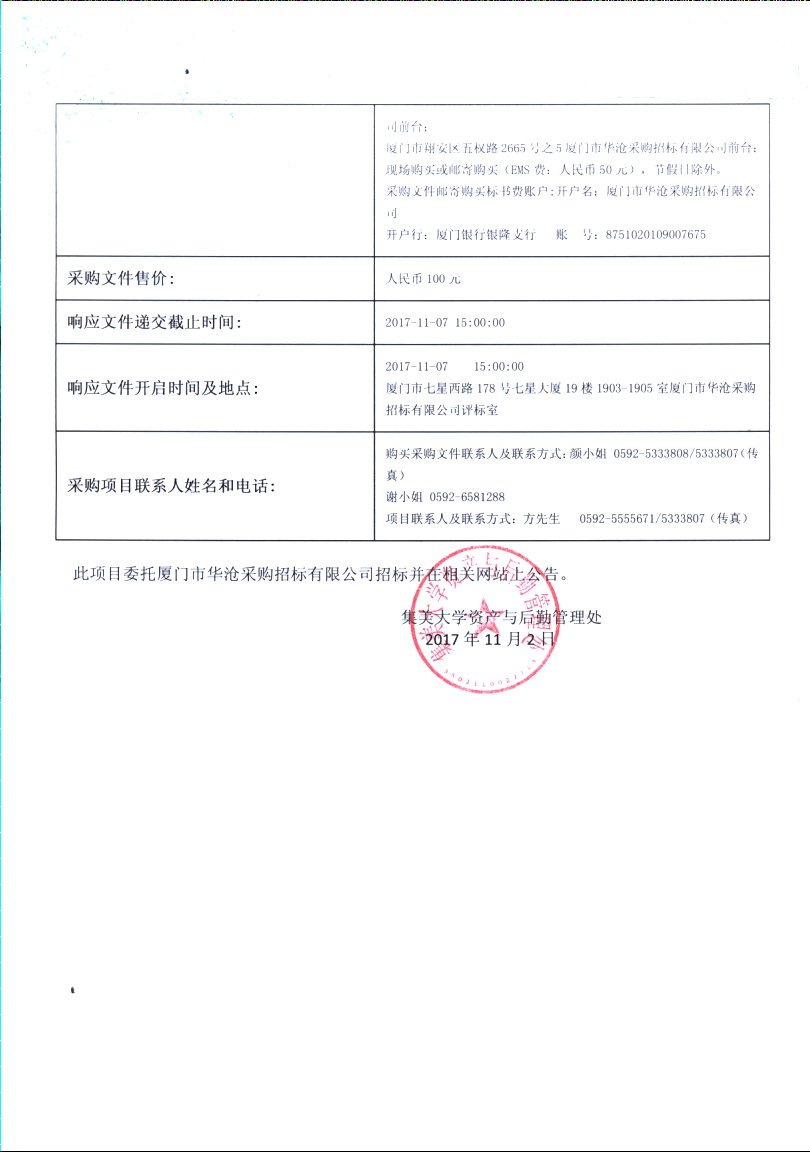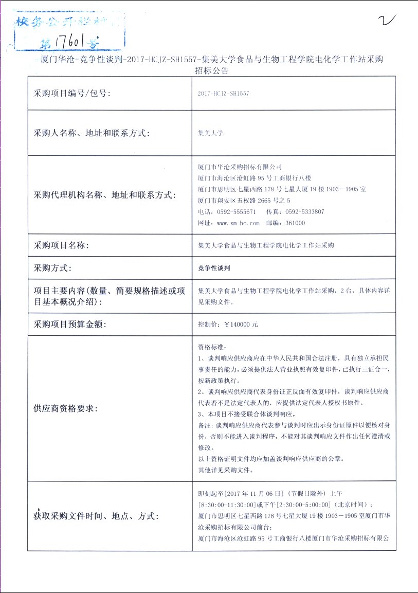 厦门华沧-竞争性谈判-2017-HCJZ-SH1557-集美大学食品与生物工程学院电化学工作站采购招标公告
