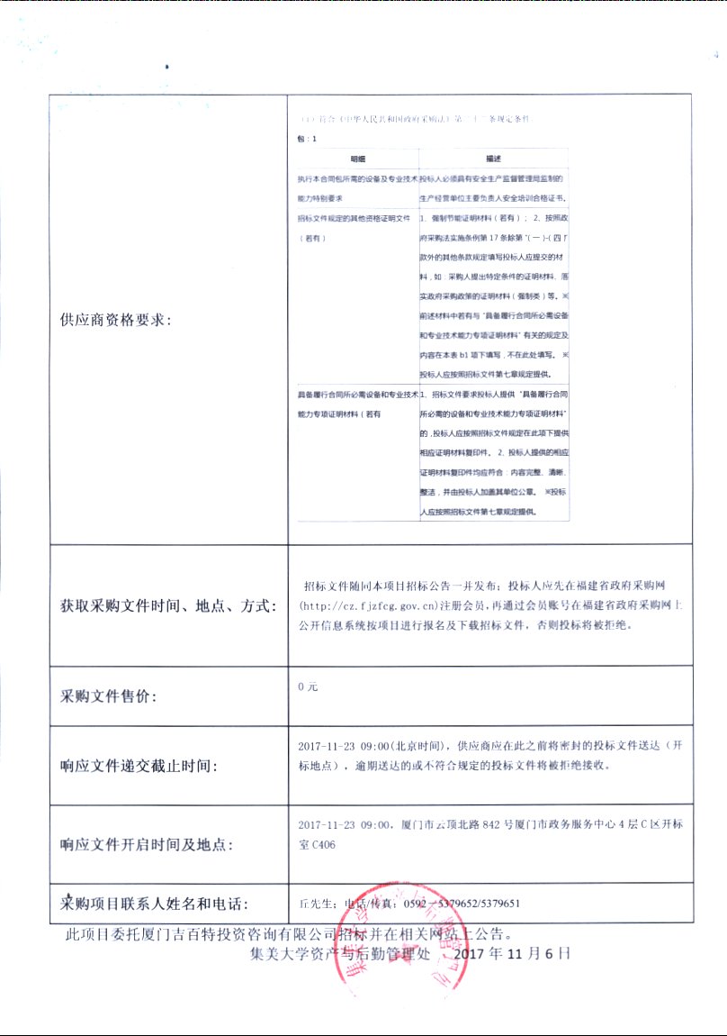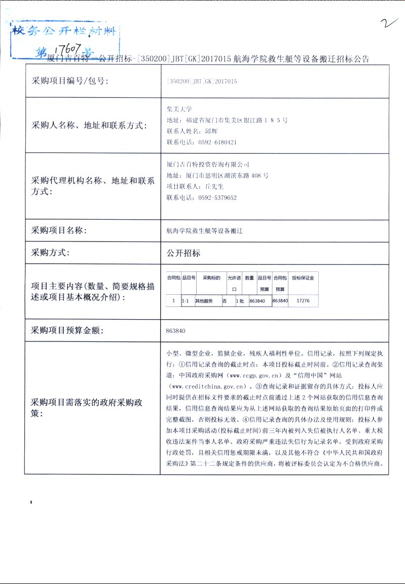 厦门吉百特-公开招标-[350200]JBT[GK]2017015航海学院救生艇等设备搬迁招标公告
