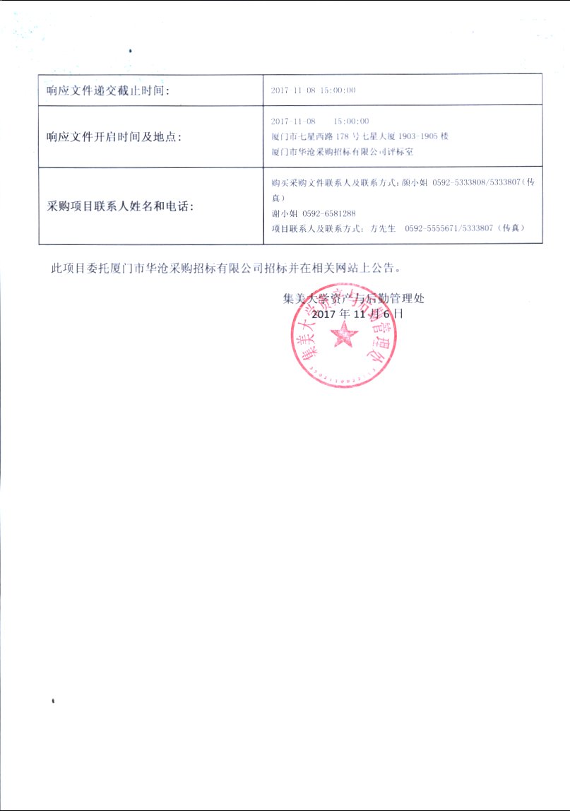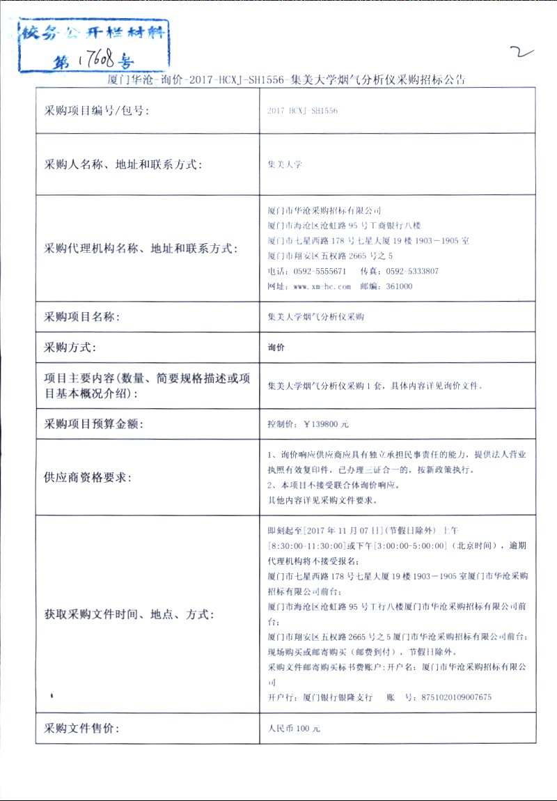 厦门华沧-询价-2017-HCXJ-SH1556-集美大学烟气分析仪采购招标公告