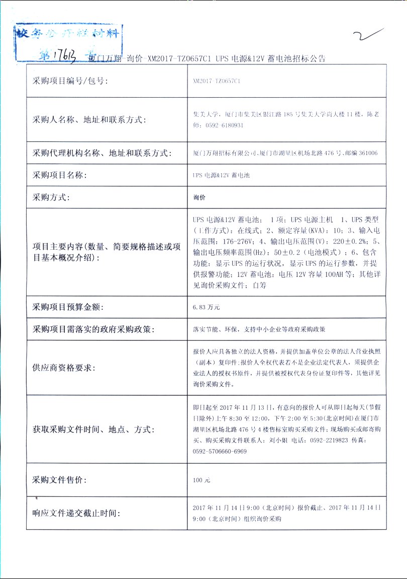 厦门万翔-询价-XM2017-TZ06257C1 UPS电源&12V蓄电池招标公告