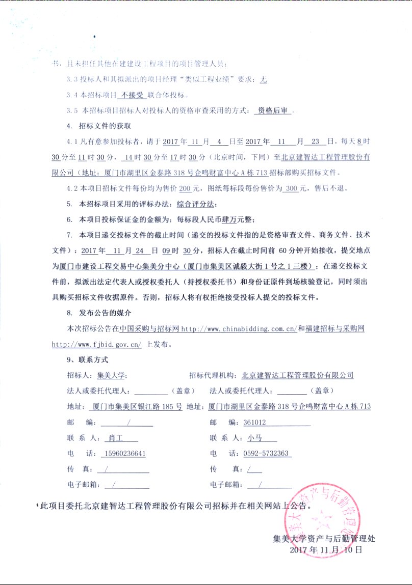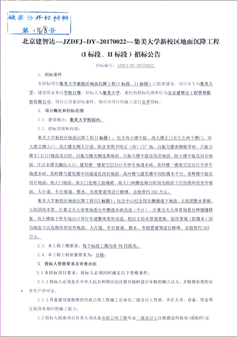 北京建智达--JZDFJ-DY-20170022--集美大学新校区地面沉降工程(I标段、II标段)招标公告